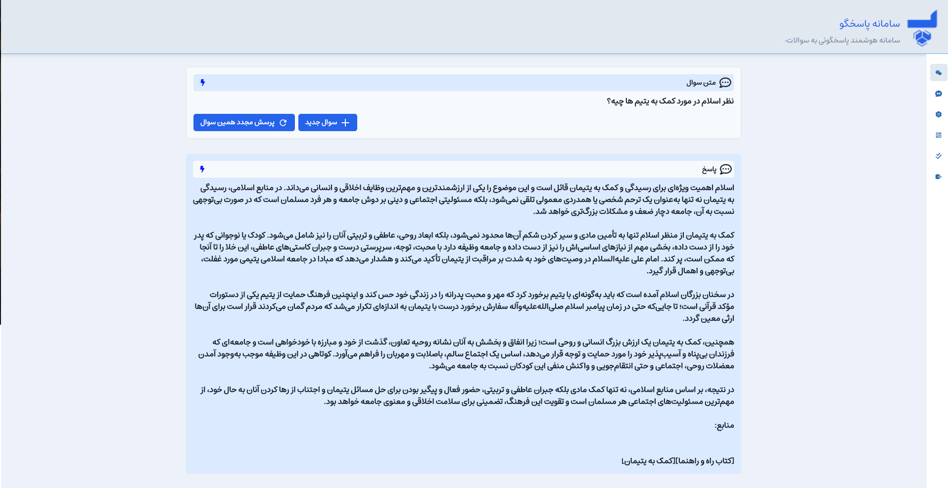 در این پروژه، یک چتبات سازمانی پیشرفته برای یکی از نهادهای بزرگ ایرانی توسعه و پیادهسازی شد که قابلیت پردازش و یکپارچهسازی هزاران کتاب، راهنما و سند در فرمتهای متنوعی همچون PDF، Word، HTML، JSON، متن ساده، XML و پایگاهدادههای ساختیافته را داراست. این سامانه بر پایه معماری پیشرفته RAG طراحی شده و با الگوریتمهای بازنویسی هوشمند پرسش، ریرنکر و ارجاع دقیق، پاسخهای بسیار مرتبط و دقیق ارائه میدهد. همچنین امکان مدیریت تاریخچه کاربران، گفتگوهای چندمرحلهای، دسترسی پویا به سرویسها و APIهای بیرونی، و پاسخدهی تطبیقی (کوتاه، متوسط، بلند) بر اساس نیاز کاربر فراهم شده است. امنیت و محرمانگی اطلاعات با استفاده از مدلهای زبانی محلی تضمین شده و با بهینهسازیهای پیشرفته، بیش از ۹۵٪ پرسشها در کمتر از یک ثانیه پاسخ داده میشوند.